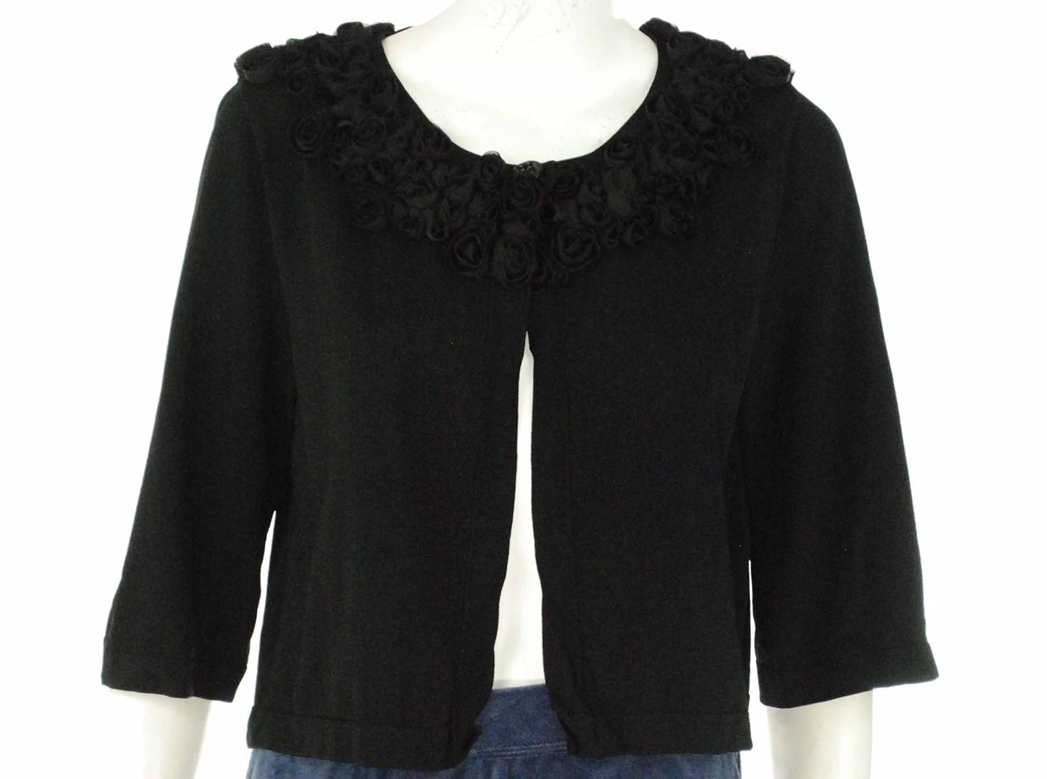 Product Description : Jacket features a round neck with rosettes and a single button closure.