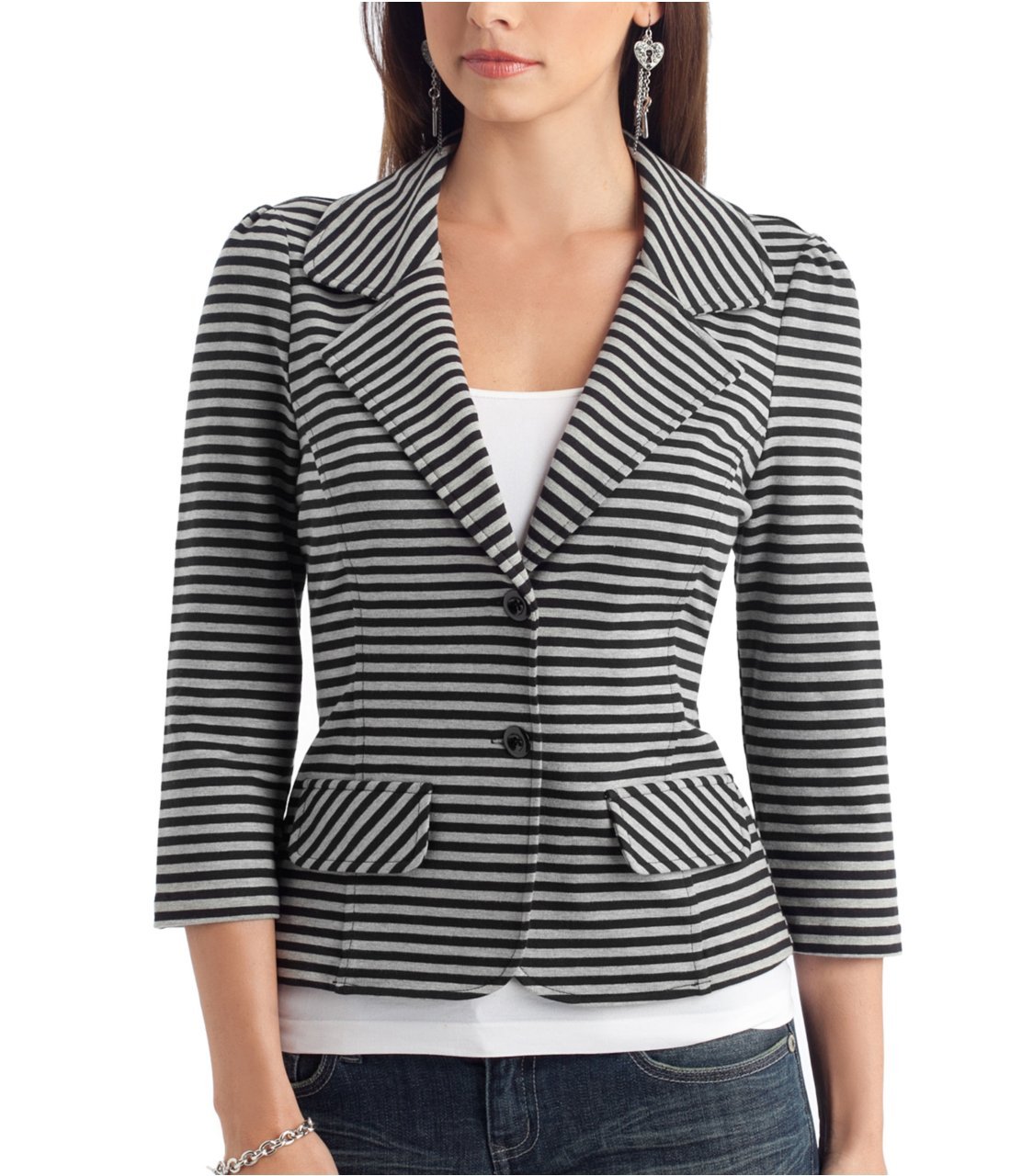 Product Description : A comfortable and casual way to dress up your look. Striped knit blazer with a two-button closure. Single-breasted. Faux front pockets. Notch lapel. 58% cotton, 39% polyester, 3% spandex Machine wash Women's > Jackets & Coats > Blazers & Fashion